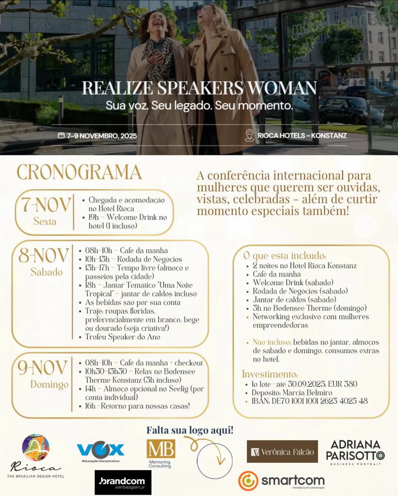 Nos dias 7, 8 e 9 /11 /2025, o Realize Speakers Woman é o lugar certo para você se conectar com mulheres brasileiras que empreendem e lideram fora do Brasil, com empresários brasileiros e internacionais que estão na vanguarda do mercado de palestras.